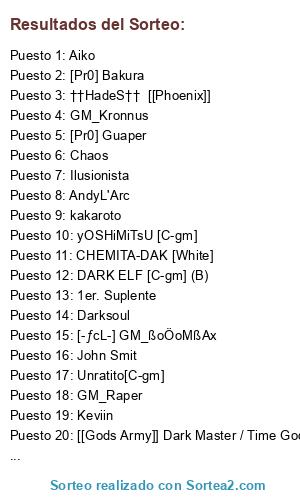 Lista de participantes: POLUX [LSK], John Smit, Chaos, Aiko, DARK ELF [C-gm] (B), S.S."†"A&D"†" Minos [Paladin Celestial], yOSHiMiTsU [C-gm], GM_Raper, [Pr0] Guaper, Darksoul, [Pr0] Bakura, Shikamaru-DAK, [-ƒcL-] GM_ßoÖoMßAx, kakaroto, Keviin, GM_Kronnus, ††HadeS†† [[Phoenix]], Hippie RYP, CHEMITA-DAK [White], Unratito[C-gm], Ilusionista, [[Gods Army]] Dark Master / Time God /, AndyL'Arc, 1er. Suplente.