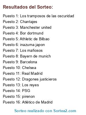 Lista de participantes: los tramposos de las oscuridad, bor.dortmund, inazuma japon, bayern de munich, Barcelona, Dragones justicieros, Los reyes, Atlético de Madrid.