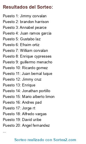 Lista de participantes: Jonathan portillo, Angel fernandez, Franco javier, Carlos gomez, Jorge rt, Alejandro limon, brandon harrison, guillermo menacho, Esteban carreto, Ricardo arzola, Daniel alberto mejia, Juan bernal luque, Mario alberto limon, Ricardo gomez, Efraim ortiz, Sebastian uribe, Oscar santos, Angel semiesponjosito, Nicolas aroca, Omar perez, William corvalan, Enrique, Jimmy corvalan, David uribe, Efra limon, Alex ortiz, Enrique cypresses, Alfredo vargas, Krlos duran, Andres pad, Gustabo laz, Annabel pearce, Luis beulo, Ricardo rodriguez, Jimmy cruz, Juan ramos garcia, Samy salas.