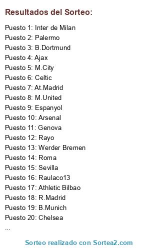 Lista de participantes: At.Madrid, Palermo, Ajax, Inter de Milan, Barcelona, B.Dortmund, R.Madrid, M.United, Rayo, Roma, Werder Bremen, Schalke 04, Arsenal, Sevilla, Raulaco13, Genova, Chelsea, B.Munich, M.City, Espanyol, Valencia, Athletic Bilbao, Oporto, Celtic.