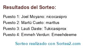 Lista de participantes: Martü Cueto: marttus, Emmeh Verdun: Emeehdeeme , Lauti Daste: Tukicasiprox, Joel Moyano: nicocasipro.