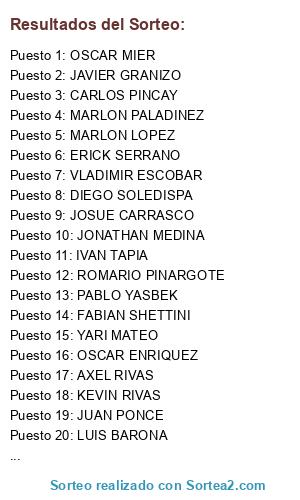 Lista de participantes: CARLOS NAVARRETE, DIEGO GUZMAN, PABLO SOTOMAYOR, GABRIEL YÉPEZ, JOSE PINARGOTE, MARCELO BOLAÑOS, DANIEL ORTEGA, GABRIEL TOALA, ROY FRANCO, DANIEL GARRIDO, CARLOS BETANCOURT, DARIO MORLA, FABRIZZIO CISNEROS, JOEL ARROBO, GIANCARLO ARIAS, KEVIN SERRANO, JUAN CARLOS CISNEROS, AXEL RIVAS, JUAN PONCE, WILSON GARCÍA, DANNY QUILUMBAY, GERARDO SALAS, CARLOS CASTRO, DARLING PINARGOTE, MARLON PALADINEZ, SEBASTIAN MENDOZA, MAURICIO ABARCA, JEFFERSON OROZCO, FABRY QUIJIJE, ALLEN RONQUILLO, ROBERTO FLORES, JEREMY MOLINA, LUIS BARONA, JHON PAUL RUIZ, OSCAR LARREA, NICOLAS VÉLEZ, SEBASTIAN VILLENA, VICTOR BRYAN, ALEX HIDALGO, PAUL LOJA, AMILCAR POGO, CARLOS DÍAZ, MATEO MARROQUIN, CARLOS CARCELEN, JUAN CARLOS SANCHEZ, OSCAR ENQUIEZ BARONA, VLADIMIR ESCOBAR, JOSE DANIEL FUENTES, BOLÍVAR PARRA CARRION, XAVY VELOZ BALDEON, DAVID ALEXANDER GUERRA, MIGUEL MORA, ANTHONY JÁCOME, ISRAEL ÁLVAREZ, CARLOS ARANA, ADRIAN BERMEO, ALEX CORTAZAR, RICKY VERDESOTO, FELIPE TIAPANTA, ANDRES VILLACÍS, NICO DELGADO, JUAN PABLO GUTIERREZ, CARLOS CACERES, SEBASTIAN FELIPE HERNÁNDEZ, MAURO GÓMEZ, KELVIN CHAVEZ, JHORDAN ARELLANO, ESTIVEN RUIZ, ERICK SERRANO, CHRISTIAN PINARGOTE, JOSUE OBANDO, GERMAN ALBORNOZ, CHRISTIAN SOLEDISPA, MARI MATEO CAHUASQUI, JOSUE CARRASCO, SANTI ACUÑA, MARLON FERNANDEZ, RICARDO CARVACHE, SAID BASTIDAS, LUIGGI LUDUEÑA, DIEGO SOLEDISPA, JAVIER SOLEDISPA, MATEO SERRANO, RICARDO SOTALIN, DOMINICK ACUÑA, RICARDO ARROBO, CAMILO GARZÓN, SANTIAGO CAMACHO, VICENTE NICOLA, JONATHAN MEDINA, JULIO FRANCO.