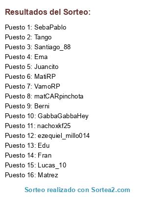Lista de participantes: ezequiel_millo014, MatiRP, Matrez, Tango, Juancito, Fran, Santiago_88, matCARpinchota, Lucas_10, nachoxkf25, Berni, GabbaGabbaHey, Edu, Ema, VamoRP, SebaPablo.