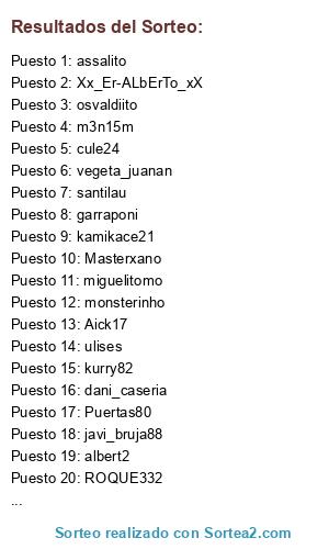 Lista de participantes: JBV13, -DRebo-, 2102, ALNA25, Aick17, Anikilator, BaLaGoL, CAPITAN_SALAMI81, CHiMeNiNHo, CristianTheKiller, DUGLASS, Dag89, Deiviz, DomiN, Eugeni, Flako_jmays, FraNk!, Gores19, Gurkham, HaRRyMoN, Hell_, Hybrid, IKER 00, IL-CAPPO, Isra_21, JORGE__73, Kamaleon1991, LGBRABO, LoLiKko, MACHINE_1986, MINGUEZ AB, MaKiKiLL, Masterxano, Memphis_GT, NorriS_28, Olibong, Owodjaye82, P0RTILL0, PAU_24, PL-Superdinho, Puertas80, ROQUE332, Ravenn8, Requich, Rosen_sueca, ShelbyGT, Sk0rpio, Sony793, Splass, Sugerman, Tomasitooo, Trammel, XeXiiMaNiiAkoOo_, Xx_Er-ALbErTo_xX, ZeQuI, Zizou_tikitaka, Zlatantf, _-CaTa-_, _valin_, a902079, adrianmaese, adry_talega, albeerrtt92, albert2, alicate, andres13082002, angelcop83, antoniobetico, assalito, benitosk8, bola15, brollon_21, bubo_79, bustammm, cabernicola25, camacho4378, carlitos69, carlosmillan, cazorliyaaa, chenchoka, chuska_jimy, cipotti, claser, cortex, cristian_hospi, cule24, d4v1d_f3n1x, dacalex, dani_caseria, davilinho1978, eL_SacRiis.., ebenzakour00, elfiera_bayer, elmakina77, elnene, elreydelpro, erkobra, ermaki-10, fran82-, garraponi, gullo_2107, hashell, ja_c12, javi_bruja88, javi_hospiii, javitin79, jcarlinho19, jimeninho84, jlrc83, jony_cieza, jose-betico, joseca96, jsnegro, juabiyo, juanblaky, juandy1989, juanvi2010, jusjos17, kamikace21, kilercris, kurry82, lacho88, lakylu, lluismc11, lolinhoutrera, lolito22, lucas-claudyo, luis_22, m3n15m, macvid, manoduramou, marlitoo, maykelillo9, mescamilla, messii10, miguelitomo, miguelynho69, miqueas, monsterinho, mordysk, mortoro, nachomori24, nostrasotodamus, oscarbetico96, oskar16, osvaldiito, pablito55gol, pabloartista, palillo_10, pejin1985, perss, pitu1493, playfutbol97, rafanaa, richi_sanfer, rojo2, roqueluis, ruperrouba, sandro_svb, santilau, sebaspro, sefirottt, sforito24, sidius15, skundisklan, spesial96, the95walker, tlusez, torviteam, troyano24, ulises, undebel, v1k1ng0rmcf, vegeta_juanan, vicente_el_mas, vichin7, wakandu, woko, xXSeVi_STyLeXx, xamusky, xatuxixon, yeray15, vergarinho.