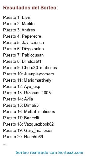 Lista de participantes: Belloto, Elvis, Xaviloko, Pablocusan, Nachhh69, Marlito, Dima63, Baricelli, Avila, Realmurcia, Selinichev, Juanperos, Peperecre, Juanplayromero, Elmanue_15, Valle, Ayo_esp, Blindcat91, Cheru30_mafiosos, Metral_mafiosos, Rizopas_1005, Danidante, Javi cuenca, Lincedeo, Vazquezbook82, Gary_mafiosos, Ferrari, Lolito, Andrés, Mariomartinely, S_joker_vc_21, Diego salas.