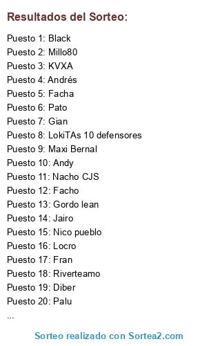 Lista de participantes: Tango, Locro, Millo80, Andy, Gian, Gustavo, Jairo, Facha, Riverteamo, Gordo lean, Fran, Locke, Nico pueblo, LokiTAs 10 defensores, Maxi Bernal, Palu , Santiago, Martín, Pato, Nacho CJS, Black, Diber, Nico mod, Facho, Lega, KVXA, Walter, Andrés.