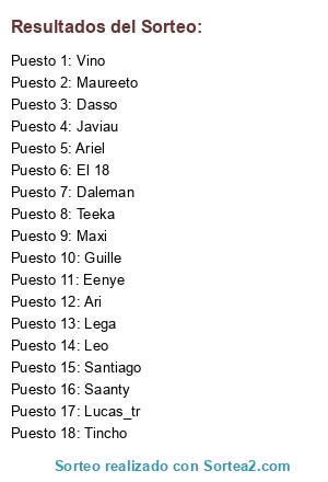 Lista de participantes: El 18, Ari, Lega, Eenye, Lucas_tr, Guille, Dasso, Tincho, Saanty, Vino, Santiago, Teeka, Ariel, Daleman, Maureeto, Javiau, Maxi, Leo.