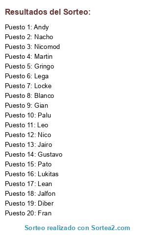 Lista de participantes: Jalfon, Lukitas, Fran, Lean, Andy, Nico, Nacho, Leo, Gustavo, Palu, Pato, Locke, Gringo, Martin, Jairo, Gian, Lega, Blanco, Nicomod, Diber.