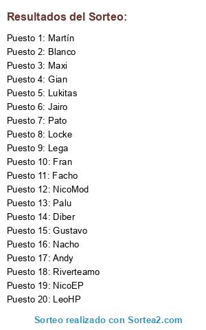 Lista de participantes: Nacho, Martín, Palu, Jairo, Fran, NicoMod, NicoEP, LeoHP, Lukitas, Blanco, Andy, Facho, Gustavo, Maxi, Gian, Riverteamo, Lega, Diber, Pato, Locke.