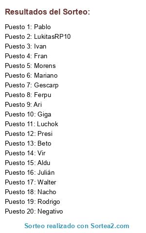 Lista de participantes: LukitasRP10, Ari, Gescarp, Morens, Aldu, Beto, Rodrigo, Julián, Walter, Mariano, Luchok, Ferpu, Ivan, Giga, Pablo, Fran, Negativo, Presi, Vir, Nacho.