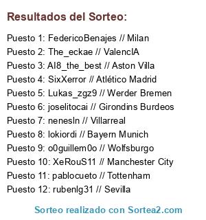 Lista de participantes: The_eckae // ValencIA, o0guillem0o // Wolfsburgo, Lukas_zgz9 // Werder Bremen, lokiordi // Bayern Munich, rubenlg31 // Sevilla, XeRouS11 // Manchester City, nenesln // Villarreal, AI8_the_best // Aston Villa, joselitocai // Girondins Burdeos, SixXerror // Atlético Madrid, pablocueto // Tottenham, FedericoBenajes // Milan.
