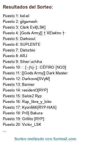 Lista de participantes: Redprotector, near, Mihawk, Minos, Salce2 Ryp, ᾧ[ -ƒcj- ]ᾧCÉFIRO [NOD], Kyori666[RYP-NAX], Clark Evil[LSK], Ares [C-gm], Silver uchiha, Rap_libre_y_loko, SUPLENTE, A&D Anakin, Victor_LSK, [[Gods Army]] Dark Master, Disturbio, «ƒмנ» Ghost [C-gm], Pr0] Bakura, Darkcore[SVyM], [Gods Army]] † XElektro †, resident3[RYP], chori89, Banner, Crusnik Drako, Darksoul, ARJ, daneiilo, Grillito [RYP], gilgamesh, kel-el, CHEMITA-DAK [White], [Pr0]Killer.