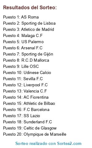 Lista de participantes: AC Fiorentina, Athletic de Bilbao, Atletico de Madrid, Celtic de Glasgow, Malaga C.F, Sevilla F.C, Sporting de Gijón, SS Lazio, Udinese Calcio, US Palermo, Arsenal F.C, AS Roma, F.C Barcelona, Lille OSC, Liverpool F.C, Olympique de Marseille, R.C.D Mallorca, Sporting de Lisboa, Sunderland F.C, Valencia C.F.