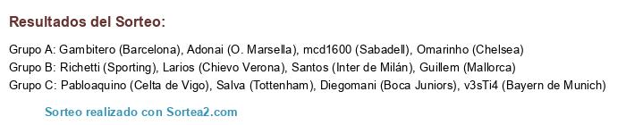 Lista de participantes: Omarinho (Chelsea), Richetti (Sporting), Salva (Tottenham), Guillem (Mallorca), Adonai (O. Marsella), Larios (Chievo Verona), v3sTi4 (Bayern de Munich), Pabloaquino (Celta de Vigo), mcd1600 (Sabadell), Santos (Inter de Milán), Gambitero (Barcelona), Diegomani (Boca Juniors).