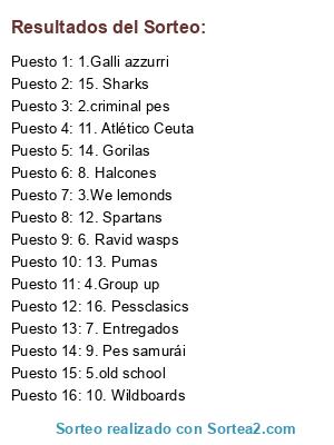 Lista de participantes: 1.Galli azzurri, 2.criminal pes, 3.We lemonds, 4.Group up, 5.old school, 6. Ravid wasps, 7. Entregados, 8. Halcones, 9. Pes samurái, 10. Wildboards, 11. Atlético Ceuta, 12. Spartans, 13. Pumas, 14. Gorilas, 15. Sharks, 16. Pessclasics.