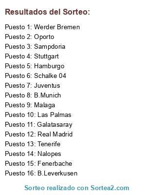 Lista de participantes: Oporto, Hamburgo, Nalopes, Fenerbache, B.Leverkusen, Schalke 04, Sampdoria, Werder Bremen, Las Palmas, Real Madrid, B.Munich, Juventus, Malaga, Stuttgart, Galatasaray , Tenerife.