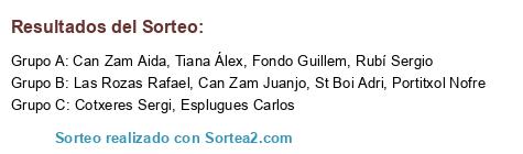 Lista de participantes: Can Zam Juanjo, Tiana Álex, Fondo Guillem, St Boi Adri, Can Zam Aida, Cotxeres Sergi, Esplugues Carlos, Las Rozas Rafael, Portitxol Nofre, Rubí Sergio.