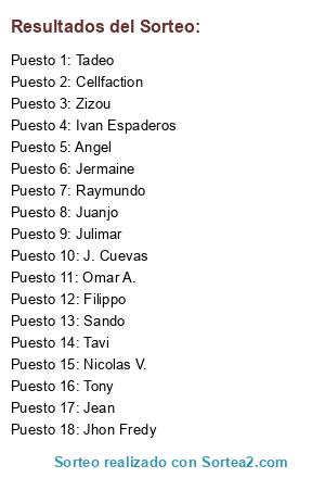 Lista de participantes: Jermaine, Jhon Fredy, Nicolas V., Omar A., Tadeo, Cellfaction, Julimar, J. Cuevas, Angel, Tavi, Tony, Sando, Filippo, Zizou, Jean, Juanjo, Raymundo, Ivan Espaderos.