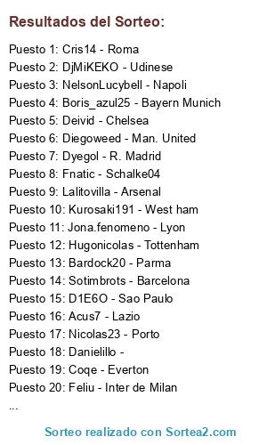 Lista de participantes: Boris_azul25 - Bayern Munich, Diegoweed - Man. United, Nashoif9 - Juventus, Banzai - PSG, Sotimbrots - Barcelona, Nicolas23 - Porto, Kurosaki191 - West ham, Eliasudec - Man. City, Dyegol - R. Madrid, Deivid - Chelsea, Hugonicolas - Tottenham, DjMiKEKO - Udinese, Lalitovilla - Arsenal, Danielillo -, Niickoo - Milan, Feliu - Inter de Milan, GaRReRo - O. Marsella, Pellejunior - Sevilla, Acus7 - Lazio, Turgon_04 - QPR, Nicolasmathias - Fiorentina, D1E6O - Sao Paulo, NelsonLucybell - Napoli, Bardock20 - Parma, Linmer - Liverpool, Cris14 - Roma, Fnatic - Schalke04, Chispita95 - Benfica, Coqe - Everton, Jona.fenomeno - Lyon.