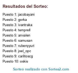 Lista de participantes: oskis, rubenyyuri, ivantraka, carlitoscg, samusan, temprell, jacobayani, anvalen, gorka, joel_opc.