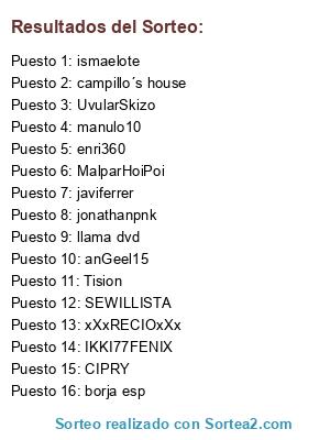Lista de participantes: CIPRY, SEWILLISTA, IKKI77FENIX, javiferrer, jonathanpnk, borja esp, enri360, anGeel15, MalparHoiPoi, Tision, UvularSkizo, llama dvd, xXxRECIOxXx, ismaelote, manulo10, campillo´s house.