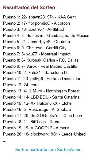 Lista de participantes: 1- Ojeda87 -Racing de Avellaneda, 2- xato21 - Barcelona B, 3- xou77 - Montreal Impact, 4- IL Muro - Notthingam Forest, 5- Roscarage - Al-Shabab, 6- Kurosaki Carlos - F.C. Dallas, 7- Varox - Real Madrid Castilla, 8- Brainismr - Guadalajara de México, 9- Chekevo - Cardiff City, 10- Borja Esp-, 11- BitDiego - Recre, 12- Xx Halcon8 xX - Elche, 13- abel 967 - Al-Ittihad, 14- LBD EDU - Santa Catarina, 15- folieviva - LA Galaxy, 16- LoPeina - Leicester City, 17- floripondioO - Alcorcon, 18- clockwork1904 - Leeds United, 19- VIGOGO12 - Almeria, 20- theGOGm4s7er - Club Leon, 21- Jony ReyeS - Cordoba, 22- spawn231974 - KAA Gent, 23- g4f5g6 - Fortuna Dusseldorf, 24- core.