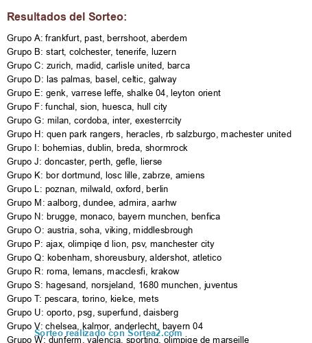 Lista de participantes: valencia, barca, madid, atletico, huesca, las palmas, cordoba, tenerife, chelsea, machester united, manchester city, quen park rangers, milwald, middlesbrough, doncaster, hull city, leyton orient, colchester, exesterrcity, carlisle united, aldershot, shoreusbury, oxford, macclesfi, losc lille, olimpiqe d lion, olimpiqe de marseille, psg, monaco, amiens, mets, lemans, milan, roma, juventus, inter, torino, pescara, varrese leffe, bayern 04, bayern munchen, bor dortmund, shalke 04, 1680 munchen, frankfurt, daisberg, berlin, rb salzburgo, admira, austria, superfund, gefle, goteba, kalmor, soha, basel, luzern, sion, zurich, ajax, psv, heracles, breda, galway, shormrock, past, dublin, bohemias, norsjeland, aalborg, aarhw, kobenham, celtic, dunferm, perth, aberdem, dundee, zabrze, kielce, poznan, krakow, benfica, oporto, sporting, funchal, brugge, berrshoot, genk, lierse, anderlecht, staberk, start, viking, hagesand.