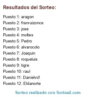 Lista de participantes: Eldanorte, Danielvcf, Joaquin, jose, moltes, alvarocolo, Pedro, tigre, franruizonce, aragon, roqueluis, raul.