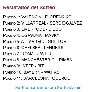 Lista de participantes: VILLARREAL - SERGIOGALVEZ, VALENCIA - FLORENKIKO, LIVERPOOL - DIEGO, BAYERN - WAITAS, BARCELONA - QUEROL, CHELSEA - LENDERS, INTER - BIT, MANCHESTER C. - PIMBA, AT. MADRID - SHEIFOR, OSASUNA - MASKY, ROMA - JAVITRI.
