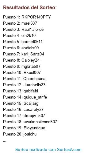 Lista de participantes: Scailarg, karl_Sanz04, Anibalin, gabifabi, reinaldo1017, bormel0511, olh2k10, josedeleon09, abdiels09, omi_rmd, Rkool007, x__Akuma__X, jona-elgalactico, cesarpty27, julito03007, Raul13forde, veraguense, josephwalls, hanselhans, terpi10, Lt_D4ngelo15, X_KaiT3n09_X, joalchu, Unleashes_hell, droopy_507, ZombieHunter224_, Urre12, Juanbells23, aztutoup, mglata507, lordofwar05, GLRCuevas & Luigi939, Emes91, Iran3031, NARUTO-50-, nestorbarria98, Chorchpana, awakensilence507, Stefano_1024, Eloyenrique, morenosworld10, Valle-siu, Nevguz, rikylokon, muel507, Black_legend27, eduardo_1326, RKPOR149PTY, Carkam10, IVAR_D, quique_strife, FISTO06, Calch28, Caloley24.