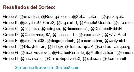 Lista de participantes: @nico_vrsalovic, @diegoigudech, @gonzayeta, @ceigloes, @_julian_11_, @crisomedina, @AngeloUdechile, @andres_vasquezg, @TomasTapiaP, @Dbaytelman, @saastian01, @soydelaU_Chile2, @Seba_Tatan_, @CristobalEddyH, @Joaquinhdh, @il_bandito, @lagazul11, @EZ7_Azul, @xalaaan, @Niicccoooo1, @ChinoSepulveda3, @wadyadsl, @lennon_dr, @GuatonRonaldo, @Rodrigo16esc, @Guillermosg87, @Mathimadsen, @rodrigeo, @alquimist08, @erwinlda, @nachiso_u, @Edogv.
