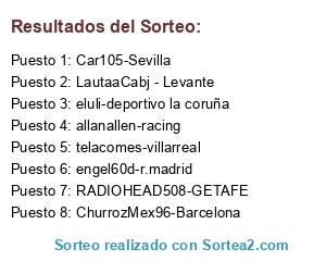 Lista de participantes: eluli-deportivo la coruña, ChurrozMex96-Barcelona, tban30- athetic bilbao, engel60d-r.madrid, A. Madrid - Marcoo95, ElSalvador - Valencia, telacomes-villarreal, Car105-Sevilla, RADIOHEAD508-GETAFE, LautaaCabj - Levante, eas11- osasuna, allanallen-racing.