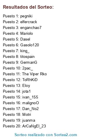 Lista de participantes: Mariolo, ToRhKiD, titospain, ArCaNgEl_23, GermanG, king_, Dasel, Gasolo120, malignoO, Eloy, ivan_155, jota1, 2pac_, juanma, enganchao7, The Viper Rko, Dan_No2, elfercrack, Motri, pegniki.