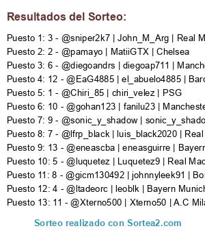 Lista de participantes: 1 - @Chiri_85 | chiri_velez | PSG, 2 - @pamayo | MatiiGTX | Chelsea, 3 - @sniper2k7 | John_M_Arg | Real Madrid, 4 - @ltadeorc | leoblk | Bayern Munich, 5 - @luquetez | Luquetez9 | Real Madrid, 6 - @diegoandrs | diegoap711 | Manchester City, 7 - @lfrp_black | luis_black2020 | Real Madrid, 8 - @gicm130492 | johnnyleek91 | Borussia Dortmund, 9 - @sonic_y_shadow | sonic_y_shadow12 | Juventus, 10 - @gohan123 | fanilu23 | Manchester United, 11 - @Xterno500 | Xterno50 | A.C Milan, 12 - @EaG4885 | el_abuelo4885 | Barcelona, 13 - @eneascba | eneasguirre | Bayern Munich.