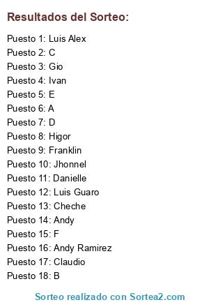 Lista de participantes: Luis Alex, Cheche, Gio, Jhonnel, Franklin, Claudio, Andy, Danielle, Ivan, Luis Guaro, Andy Ramirez, Higor, A, B, C, D, E, F.