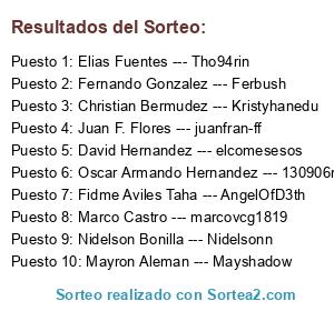 Lista de participantes: Elias Fuentes --- Tho94rin, David Hernandez --- elcomesesos, Marco Castro --- marcovcg1819, Juan F. Flores --- juanfran-ff, Christian Bermudez --- Kristyhanedu, Oscar Armando Hernandez --- 130906natan, Mayron Aleman --- Mayshadow, Fidme Aviles Taha --- AngelOfD3th, Nidelson Bonilla --- Nidelsonn, Fernando Gonzalez --- Ferbush.