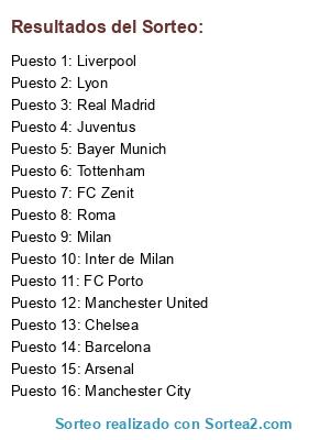 Lista de participantes: Barcelona, Arsenal, Real Madrid, Roma, Inter de Milan, Milan, Manchester United, Manchester City, Juventus, FC Porto, FC Zenit, Lyon, Chelsea, Bayer Munich, Liverpool, Tottenham.