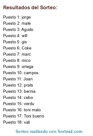 Lista de participantes: Coke, ortega, mico, marc, gis, vali, cebo, mate, will, campos, Toni bueno, toni malo, bernia, jorge, prats, verdu, Joan, Agudo.