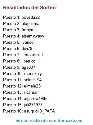 Lista de participantes: franjm, alopezma, lipenico, ricamar, poveda22, divi79, ivancol, polete_94, aga007, juli271977, rubenkaly, j_navarro11, elmele23, usurpio13_PAPA, algarcia1985, elsamywayy.