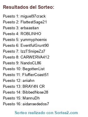 Lista de participantes: BegottenList, IzzTSniipeZz7, EventfulGrunt90, CARWERVA412, erbaastian, miguel97crack, aidansededos7, FlattestSage21, NandoCL86, yummyphoenix, MannuDh, BRAY4N CR, BibbedNose28, FluffierCoast51, ROBLINHO, ariiahn.