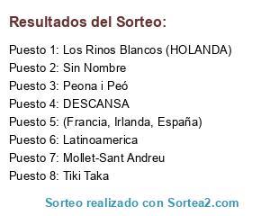 Lista de participantes: Tiki Taka, Sin Nombre, Los Rinos Blancos (HOLANDA), Mollet-Sant Andreu, (Francia, Irlanda, España), Peona i Peó, DESCANSA, Latinoamerica.