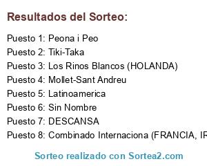 Lista de participantes: Latinoamerica, Peona i Peo, Tiki-Taka, Los Rinos Blancos (HOLANDA), Combinado Internaciona (FRANCIA, IRLANDA, ESPAÑA), Sin Nombre, Mollet-Sant Andreu, DESCANSA.