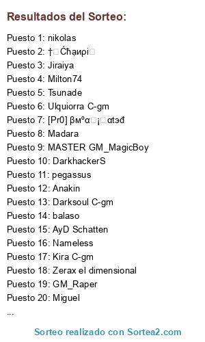 Lista de participantes: Darksoul C-gm, Gareth C-gm, Minos, MΛĐΛЯΛ UCHIΗΛ, AyD Schatten, Ψ~Goenitz~Ψ, Kira C-gm, MASTER GM_MagicBoy, L'Arc~en~Ciel , GM_Raper, Ulquiorra C-gm, A&D Aizen, Zerax el dimensional , Tsunade, DarkhackerS , Milton74, Nameless, Miguel, nikolas, [Pr0] βмºαท¡ʍαtэđ, vendetta, Nigromante, balaso, nidaime, Dash, Stratodethlml, pegassus, Anakin, Madara, Jiraiya, Edeco666, ShadoWing [C-gm], GM_Rogers, g3rM!k, †★Ćћạиρi★.