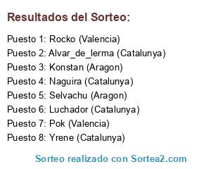 Lista de participantes: Alvar_de_lerma (Catalunya), Selvachu (Aragon), Yrene (Catalunya), Naguira (Catalunya), Luchador (Catalunya), Pok (Valencia), Rocko (Valencia), Konstan (Aragon).