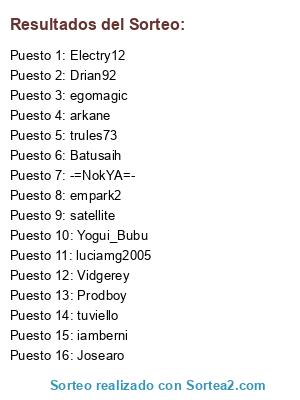 Lista de participantes: tuviello, empark2, satellite, iamberni, Josearo, luciamg2005, Vidgerey, -=NokYA=-, Electry12, egomagic, trules73, Yogui_Bubu, Batusaih, arkane, Prodboy, Drian92.