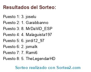 Lista de participantes: 1. Garabbanno, 2. jomalk, 3. joselu, 4. Malaguista197, 5. TheLegendarHD, 6. jordi12_97, 7. Rami6, 8. MrDaViD_ESP.