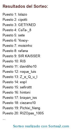 Lista de participantes: Gallato7, Perdy_trs_, ruben-94_, lucensinho, CaTa-_8, lolazo, Black-DeeviL, Z_e_Q_u_I, dani_cdsf, Ferrari_4567, hintoni, cipotti, roque_luis, cortex, mescamilla, assalito, Granmago_CA, maykelillo9, IGNACIIO94, sete, iru, davidiho10, osvaldiito, Makiki, Sk0rpio, francis15, SIR KAISSER, espI, fortopeta, alicate9, rafana, toor89, moisinho, brayan_iss, ivi_zizou_10, frankymora, burni, Xexu23, MYKYLYN, Nicolau1985, CA_el_santo_, JosePolo, Pichixi_Neng, rivaltales, gutistas, ciezano10, Sugerman, luigi carras 89, JaWbcn_, RIZOpas_1005, sefirottt, selinichev, shanero, fer1980, Yosoy-, rafarizo78, RiS, LUMPA-7, angelcop83, Dieg21Garcia, Rubi--k, GETIYAED, PaUU_24, Danitorix.