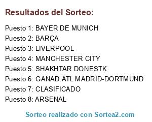 Lista de participantes: BAYER DE MUNICH, ARSENAL, LIVERPOOL, SHAKHTAR DONESTK, MANCHESTER CITY, BARÇA, GANAD.ATL MADRID-DORTMUND, CLASIFICADO.