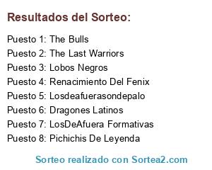 Lista de participantes: LosDeAfuera Formativas, Lobos Negros, Losdeafuerasondepalo, Renacimiento Del Fenix, Pichichis De Leyenda, The Bulls, The Last Warriors, Dragones Latinos.
