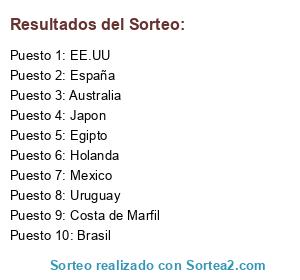 Lista de participantes: España, Holanda, Uruguay, Brasil, Mexico, EE.UU, Australia, Japon, Costa de Marfil, Egipto.
